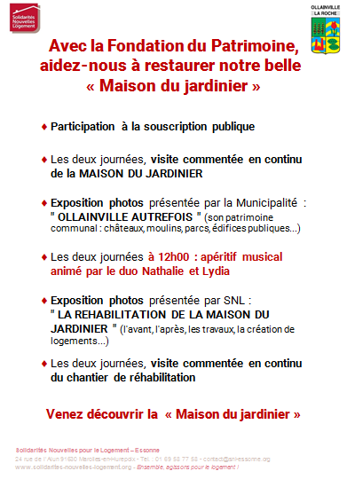 SNL Essonneà la « Maison du Jardinier » d’Olainville . les 21 et 22 septembre 2019 avec la Fondation du Patrimoine . Voir les animations. . Voir la présentation de la « Maison du Jardinier ».