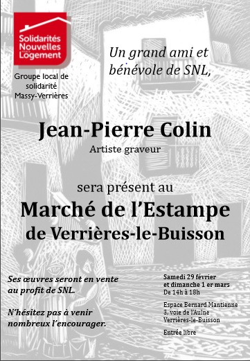 À l’occasion du « Marché de l’Estampe » de Verrières-le-Buisson, le samedi 29 février et le dimanche 1er mars (précisions données dans le document joint), il présentera et vendra ses œuvres parmi une vingtaine d’autres exposants.