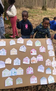 La course s’est déroulée en forêt de Sénart le samedi 22 mars dans l’après-midi. Les scouts étaient nombreux et les avaient rejoint presque tous les enfants de la rue des Grès, notre maisonnée SNL, avec leurs parents, mais aussi d’anciens locataires et notre célibataire préféré, réparateur en chef, qui, pour l’occasion, avait sorti son vélo. Le rassemblement commence par des jeux, puis on distribue à chaque enfant une petite maison en papier sur laquelle écrire ou dessiner ce que représente une maison ou un appartement pour lui. Les mots « sécurité », « calme », « tranquillité », « famille » sont très présents dans les écritsNous avons été aussi très frappés par la phrase « Le stress reste derrière la porte ». Les dessins sont variés : des lits, des chaises, des tables, plusieurs cuvettes de WC, des armoires dont une très grande dans laquelle on pouvait voir, bien disposées sur des cintres, les robes de princesse de Kya, la très coquette. Toutes ces petites maisons sont ensuite scotchées sur la grande maison en carton fabriquée par les chefs scouts. Les bénévoles disent deux mots sur ce qui ressort de ces maisons-raisons et sur ce que fait SNL pour assurer cette sécurité attendue d’un logement.